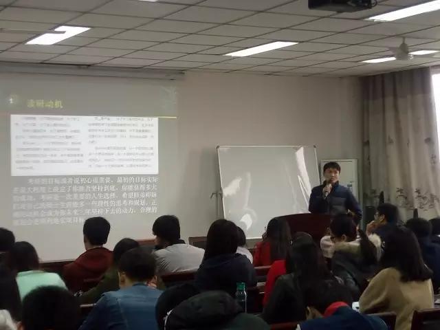 博硕生为主,呈现学生与学生交流的宏大场面。本次讨论会主要分为分享讨论和现场提问环节。首先是分享讨论环节,潘都(博士)、任勇、王立卫、张丽英四位研究生分别围绕“科研经验”、“求职经历分享”、“文章及考博经验分享” “学习、实验”、“工作学习杂谈”四个主题交流分享,同学们都收获颇丰;然后是现场提问环节,由主持人寇世雯在现场收集同学们的小纸条,向四位研究生生进行咨询,四位研究生也用他们的经验帮我们一一解答,现场气氛非常的活跃。这些经验帮助硕士研究生在日常学习、外出调研、论文写作与发表、外出参加会议以及考博准备等方面找到方向,明确目的,积累经验,同学们都受益匪浅。