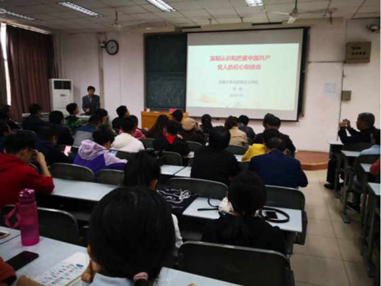 党委在金明综合楼6101教室举行“不忘初心 牢记使命”主题教育报告会,邀请马克思主义学院教授欧健做了题为《深刻认识和把握中国共产党人的初心和使命》的报告。报告由学院党委书记王宏华主持,学院全体师生党员聆听了报告。