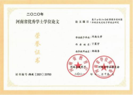 2020届物理学明德班丁震宇的学位论文《基于p-Si/n-ZnO薄膜异质结器件的压电光电子学效应研究》、测控技术与仪器专业李晨阳的学位论文《基于树莓派的无人车道路自动识别系统设计》获河南省优秀学士学位论文,指导教师郑海务、吕浩杰获河南省优秀学士学位论文指导教师。