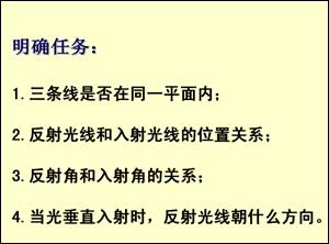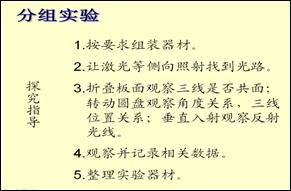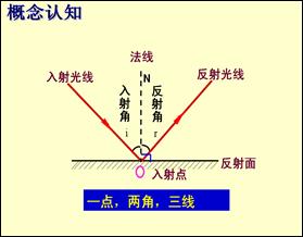 为了对实验的操作起到规范作用。以讲授方式,将反射面、入射点、入射光线、法线、反射光线、入射角、反射角这七个概念依次展示出来,强化概念的认知。