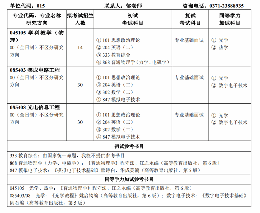 物理学、集成电路科学与工程学科为河南省重点(特色优势)学科;拥有物理学博士后科研流动站,物理学一级博士学位授权点,物理学、集成电路科学与工程2个一级学术型硕士学位授权点,电子信息专业硕士学位授权点(集成电路工程、光电信息工程)和学科教学(物理)专业学位授权点。