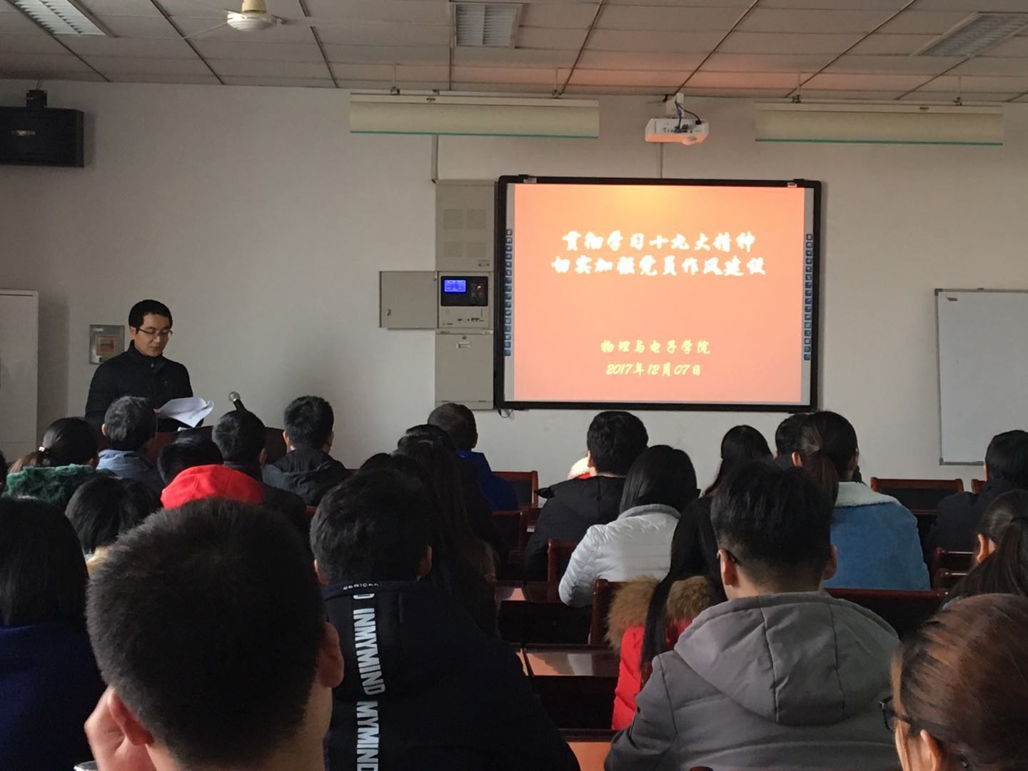 王宏华在总结时表示,学习党的十九大精神,是当前和今后一个时期的首要政治任务。要把学习党的十九大精神落实到具体的工作上来,紧紧围绕学校“一条主线、两项工程、三项基础保证”的工作思路,与“两学一做”常态化教育、“不忘初心 争创一流”专题研讨和学院“十三五”发展规划以及学院优势特色学科建设结合起来,脚踏实地、砥砺前行,努力打造物理学科,促进一流学科建设,为学校一流学科大学建设作贡献。