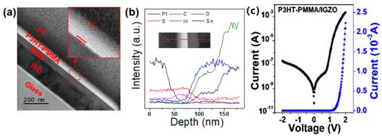 图2 P3HT-PMMA/IGZO二极管及其电学特性