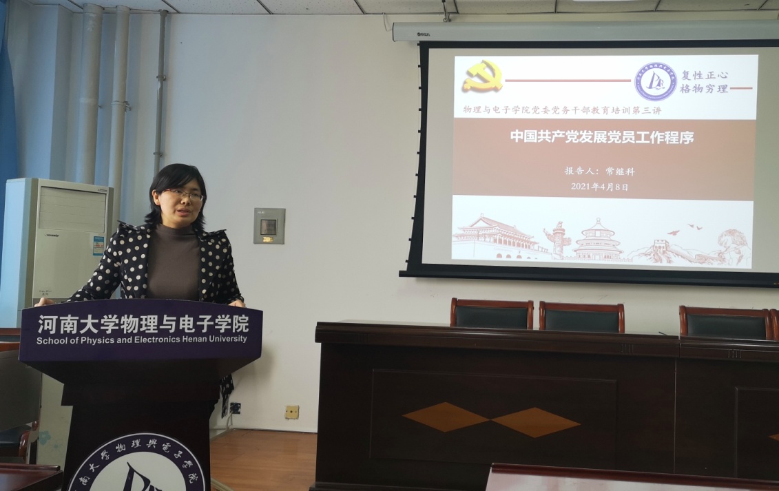 常继科以《中国共产党发展党员工作程序》为题,从中国共产党的历史出发,讲述了入党初心、中国共产党发展党员程序、党员的使命责任。报告中,她结合近年来党员发展工作中发生的典型案例,详细介绍了发展党员工作的5个阶段、25个环节。她强调,发展党员工作是一项经常性的重要工作,要严格遵守党员发展程序,切实加强党员教育管理监督,保证新发展的党员质量,保持党的先进性和纯洁性。她结合正在进行的党史学习教育,指出在庆祝我们党百年华诞的重大时刻,在“两个一百年”奋斗目标历史交汇的关键节点,每个党员都要牢记入党初心,勇担使命责任,自觉把个人发展与国家、民族发展紧密结合起来,用实际行动践行共产党员的誓言和初心。