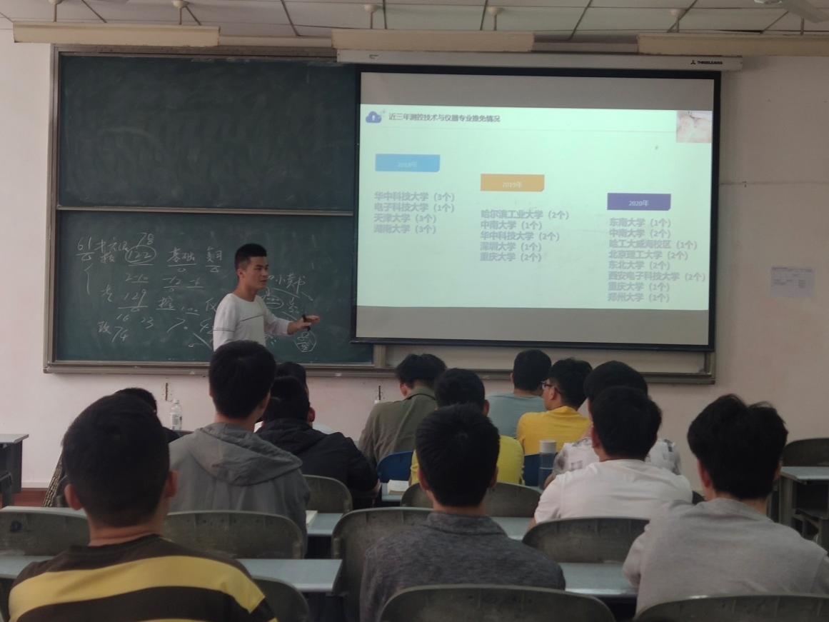 魏凌结合当前大学生考研和就业形势,分析考研优势,鼓励学生根据自身实际,明确考研目标、方向,理清考研和就业的关系。随后,考取研究生的20名学生代表分别从自身考研经历出发,围绕专业和院校选择、复习计划制定、时间管理和心态调整等方面谈了亲身体验和感受。考取华中科技大学的物理学专业的范丫琦,详细介绍了自己报名参加夏令营、考研各科目复习、初试及复试面试准备的全过程,并分享了自复习计划与技巧。考取厦门大学的测控技术与仪器专业李成卓,从考5次英语四级谈起,提出考研要提高学习效率、合理规划时间、学会控制情绪,并坚定考研信心。保送至北京大学的电子信息科学与技术专业张以凝,从推免研究生信息获取、学校和导师情况了解、个人简历准备及投递等方面分享了自己的成功经验。保送至西安电子科技大学的通信工程专业的高廷帅分享了在没有科研竞赛成果的情况下,怎样获得心仪学校的offer。2018级学生也积极向学长学姐请教自己关心的问题,分享会现场气氛热烈。