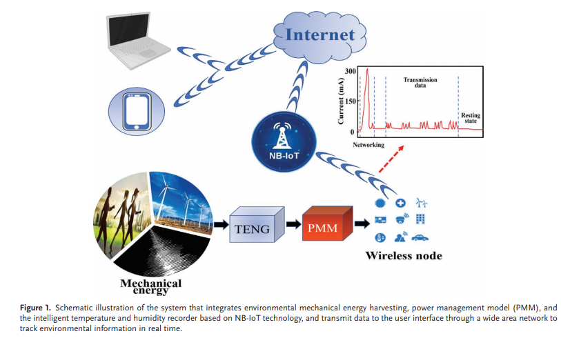 基于此,郑海务课题组提出了一种基于绣绷结构的声音驱动TENG(EH-TENG),在共振频率为170 Hz,声压为110 dB的条件下可以产生500 V的开路电压和124 μA的短路电流,在非固定频率声源下可以驱动小功率用电器。在实现了EH-TENG优良电输出性能的基础上,结合电力电子技术,提出了一种通用、可靠的TENG电源管理策略,通过阻抗变换、斩波稳压、输出方式控制等,克服了当负载功率需求大于TENG平均功率时负载无法工作的问题。文章展示了其驱动小功率家用电器、基于蓝牙的无线传感器的能力,首次实现了利用NB-IoT技术持续连接广域网,驱动商业的无线传感节点,完成远距离数据传输,为TENG在物联网领域的广泛应用奠定了坚实基础。本工作既对推进专用的TENG能量管理集成电路的设计具有指导意义,又为推动基于TENG的微纳能源的商业化应用做了有益探索。