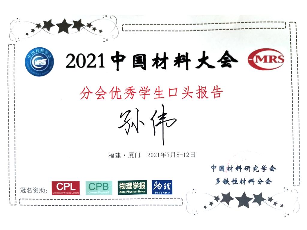 2019级博士生孙伟参加“中国材料大会-多铁性材料分会”,并作了题为“二维异质结中铁电极化对bimeron的调控”的口头报告,介绍了二维多铁材料中铁电极化对长程和短程磁序的非易失性控制方法,获得本届会议“分会优秀学生口头报告”。