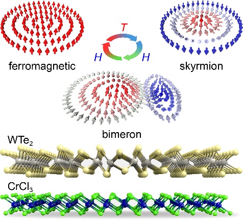 博士研究生孙伟在黄河学者李航和澳大利亚伍伦贡大学程振祥教授等人的指导下,研究了WTe2/CrCl3双层vdW异质结中的拓扑自旋纹理。自旋-轨道耦合引起的垂直各磁晶向异性有利于奈尔型斯格明子的稳定,而磁偶极-偶极相互作用引起的面内形状各向异性有利于双半子型斯格明子的稳定。在垂直磁场的存在下,可以实现斯格明子–双半子–铁磁循环转变,同时体系的拓扑性质(拓扑数)也随之反转。研究结果表明,与双半子型磁构型相比,奈尔型斯格明子获得了更高的速度和更大的斯格明子霍尔角。此外,将CuInP2S6(一种二维铁电单层膜)堆叠到异质结中,可以通过界面磁电耦合产生的电场操控斯格明子的写入和擦除。
