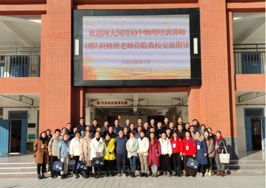 继续教育办公室主任向兵带队,2021年国培初中物理培训讲师团队研修班的40多位老师到集英中学交流参观。集英中学副校长陈慧娟陪同国培班成员,一起走进物理实验室,与罗颖名师工作室的老师们开展研讨活动。