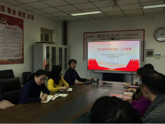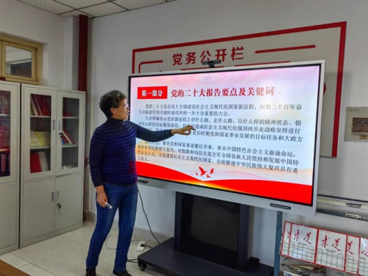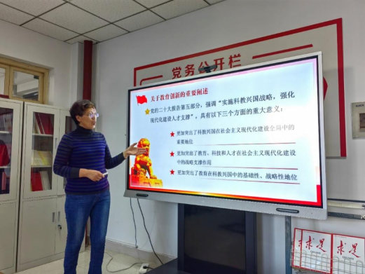 在党课讲授中,王宏华首先与支部党员一起学习领会了党的二十大报告中的主要内容,紧扣党的二十大报告中15个部分重点内容进行讲解,阐述了党的二十大召开的重要意义,并对党的二十大报告中着重强调的“中心任务”“中国式现代化”“两步走”“第一要务”“重大原则”“着力点”“国家创新体系整体效能”“全过程人民民主”等16个关键词进行了深入细致的宣讲。随后,王宏华对党的二十大报告中关于教育创新的表述进行了梳理分析:党的二十大报告将教育、科技、人才“三位一体”统筹安排、一体部署,明确了科教兴国战略的科学内涵和使命任务。她强调,党的二十大报告是党和国家未来一段时期的施政纲领,科教兴国战略更加突出了教育、科技和人才在社会主义现代化建设中的战略支撑作用。她结合学校学院发展实际,通过介绍51大赛