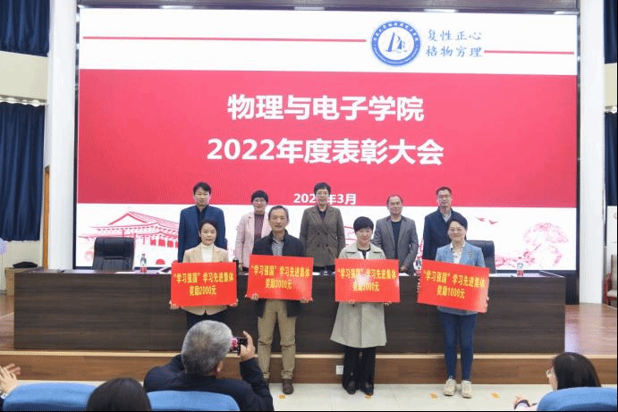关于表彰2022年“学习强国”平台学习先进个人和先进党支部的决定》。在欢快的音乐声中,学院领导依次为受表彰的先进个人和集体颁奖,获奖代表副院长魏高明、魏凌老师、康缈老师、邹炳芳老师上台分享获奖感言。