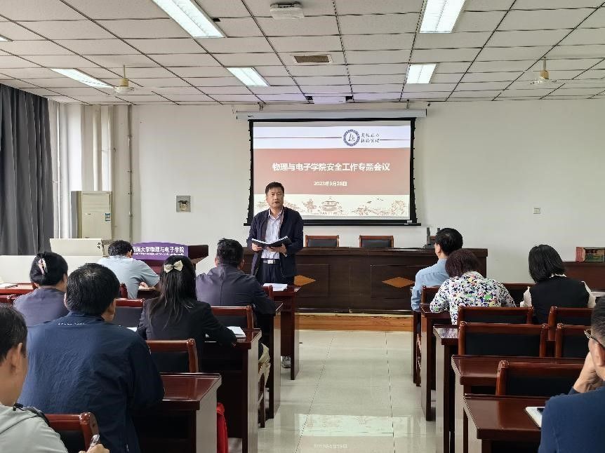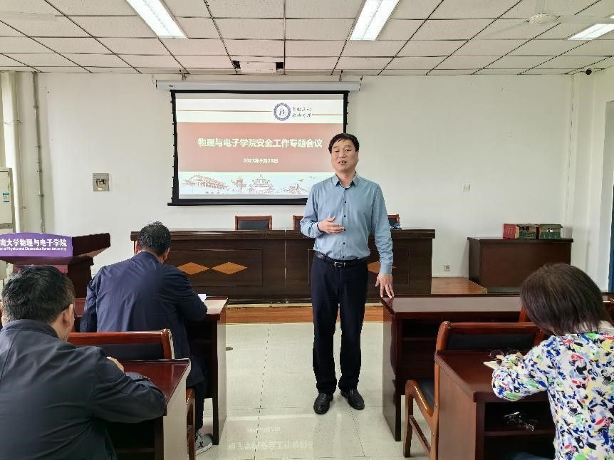 在物理楼A313会议室召开安全工作专题会议,会议由学院党委书记张慧主持,院党政班子成员、国家级实验教学示范中心负责人、系室主任、管理科室主任、科研实验室主任、安全员、辅导员参加了会议。