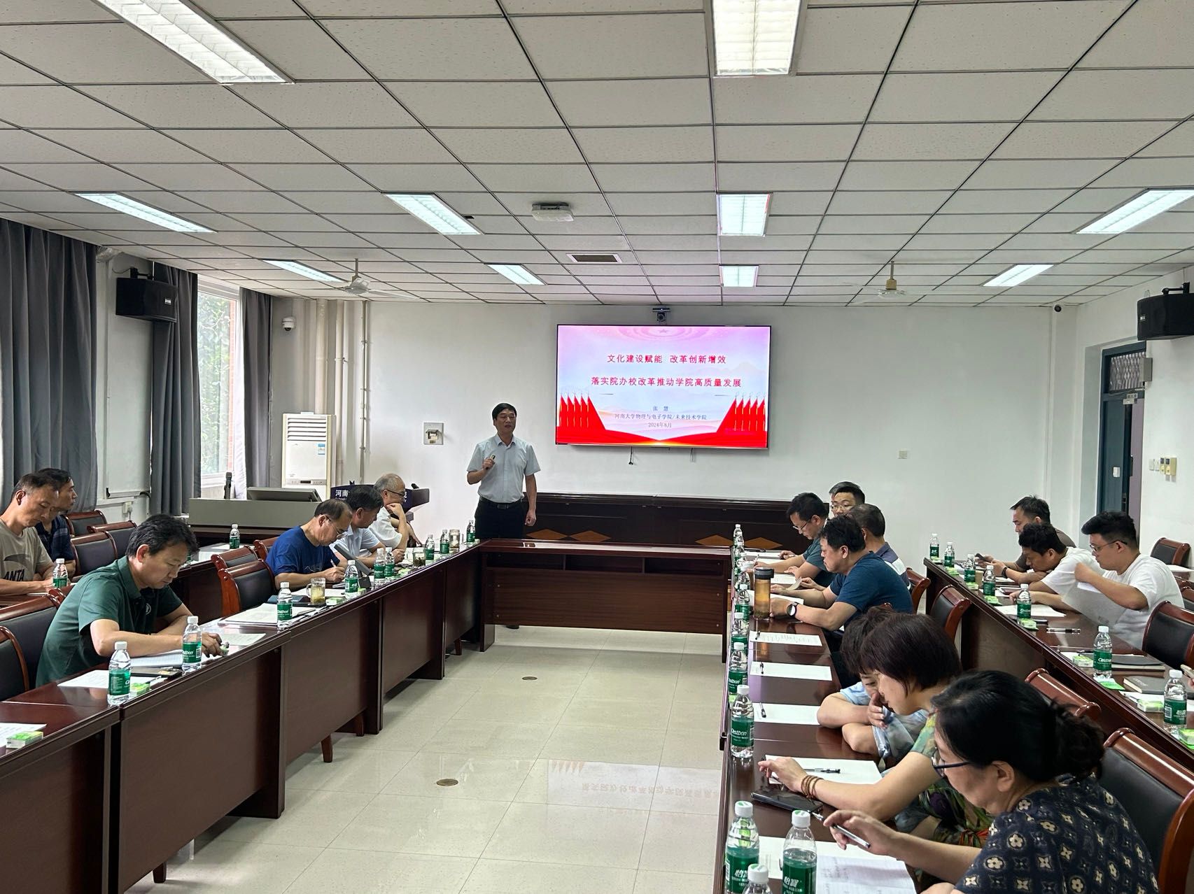 学院党委书记张慧结合学校文化建设工作部署,从推进学院高质量发展助力学校“双一流”“双航母”建设和推进院办校改革两方面作《文化建设赋能 改革创新增效 落实院办校改革推动学院高质量发展》的报告。他指出学院秉持“复性正心、格物穷理”的精神,坚守“敬业,励学,求是,创新”院训,在浓厚的文化氛围中将学院发展与建设结合起来,取得了一定的工作成效。他强调,要以只争朝夕、时不我待的工作态度,充分认识国家“双一流”河南“双航母”战略的重大意义,认识到这是学院实现跨越式发展的历史机遇。要坚持以目标管理责任制为牵引,进一步聚焦学院发展的中心任务,锚定推动学院和学科建设提质进位的重点目标任务,坚持创新发展理念,做到久久为功,善作善成,力争尽早实现“七个根本性转变”。要持续优化学院运行工作机制,充分调动教职工生活力和动力,解放思想、转变观念,以更强的责任心和更优的方式方法,坚持“十个第一”工作理念,坚决贯彻落实“院办校”改革。要持续加强文化建设,营造团结协作、务实基调、奋发向上的干事创业氛围,以学院高质量发展、学科建设提质进位,助力书写51大赛
