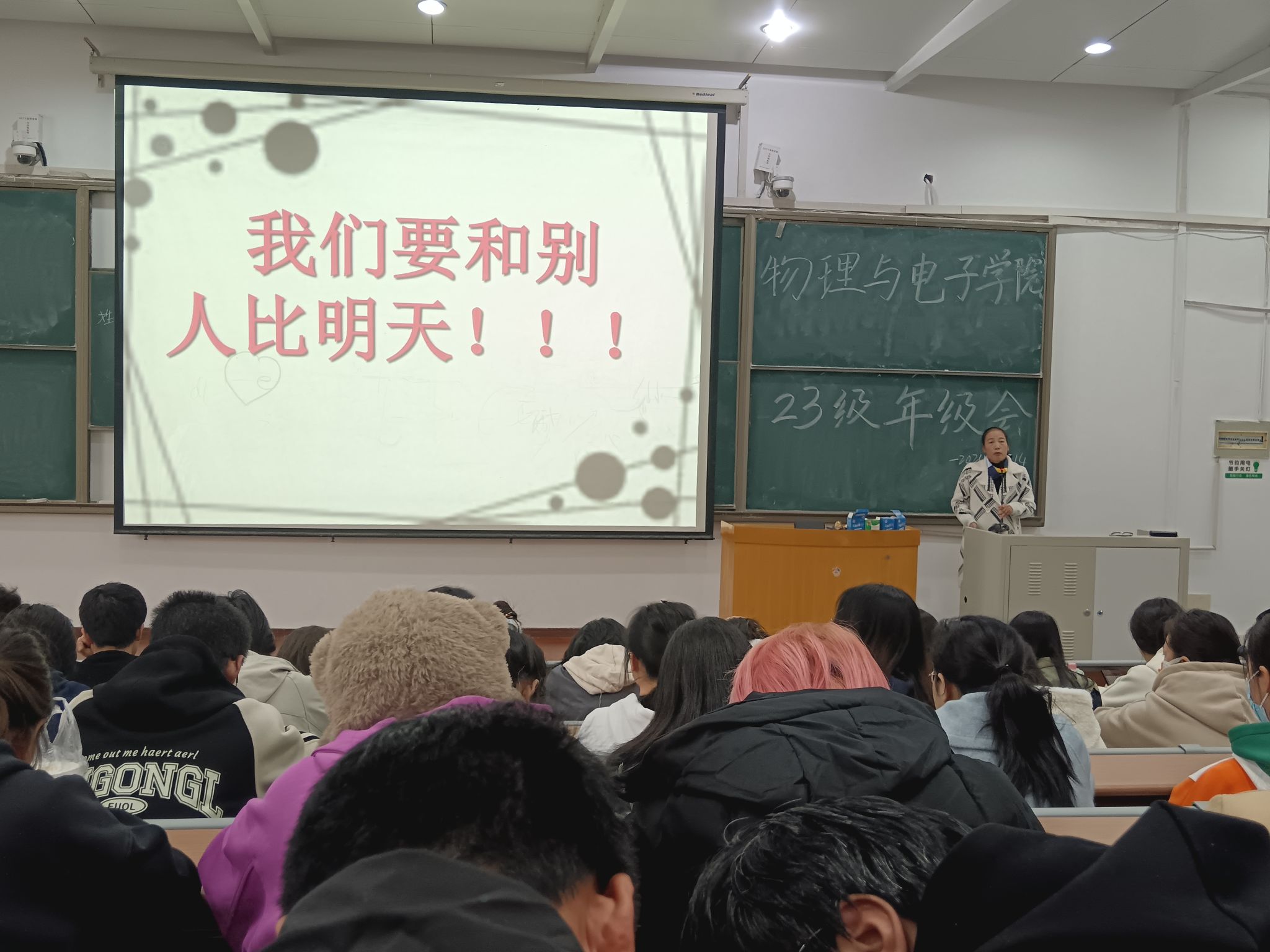 在金明校区综合楼2306教室召开2023级本科生年级会。张婷老师主持会议并围绕“大学,青春无悔!”这一主题,从班级建设、心理健康教育、人生规划以及当前目标设定等多个方面展开讲解。