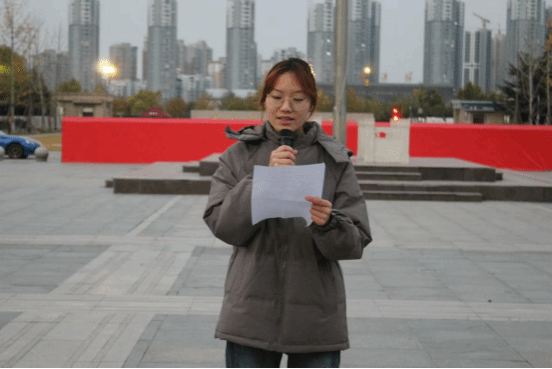 22级学生代表范露野在国旗下发言,她通过分享自己对爱国情怀的深刻理解,生动地诠释了表达爱国情怀应该落实到具体行动上。随后,她与全体同学共同承诺,将用青春和热血为民族复兴做出新时代河大青年的贡献。