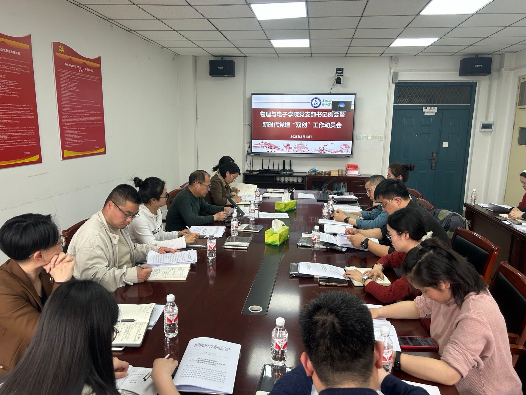 在A311会议室召开党支部书记例会暨新时代党建“双创”工作动员会,学院党委书记张慧、党委副书记刘寒冰及各党支部书记参加会议。会议由刘寒冰主持。